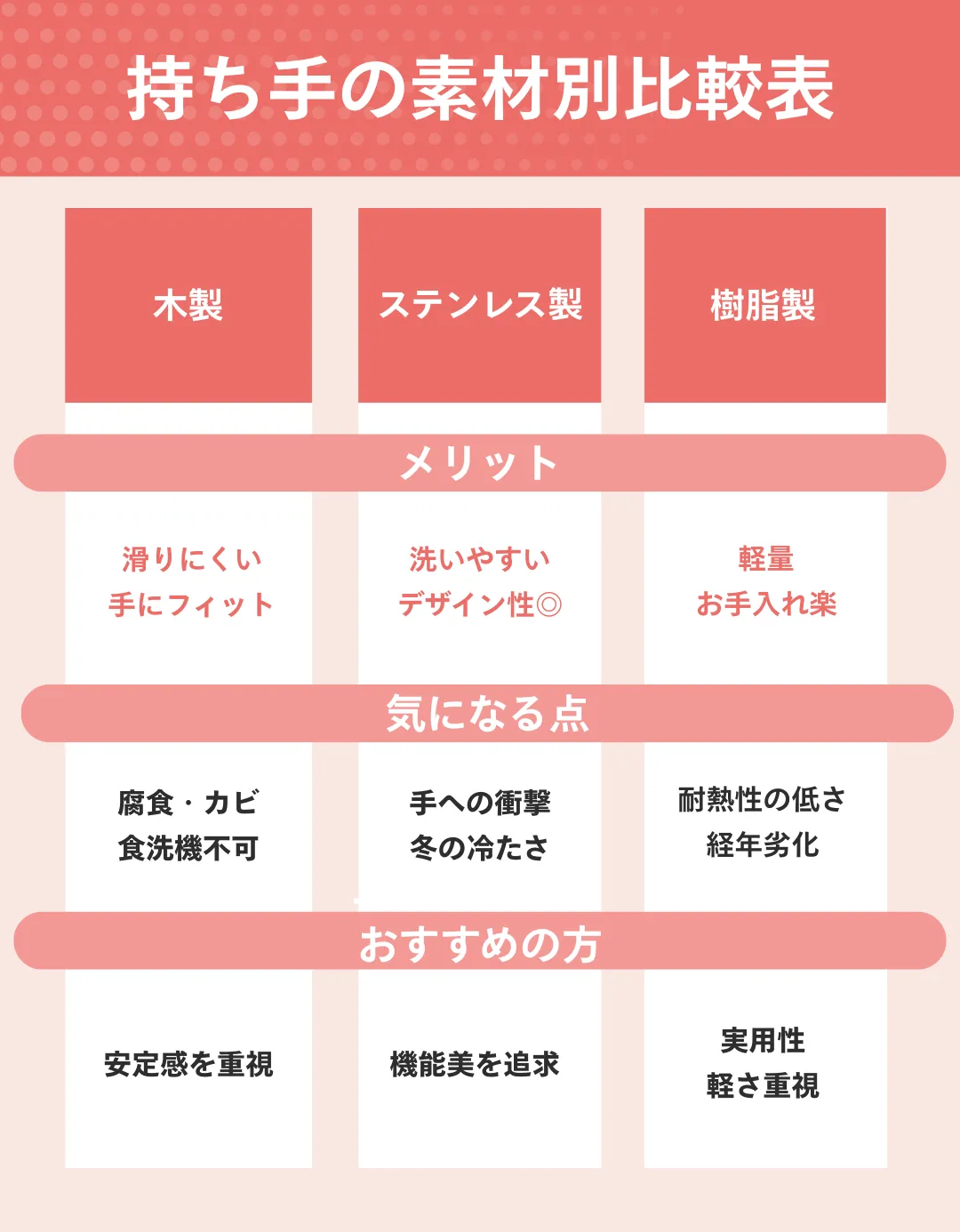 「衛生面・食洗機対応」などのハンドルの構造や素材