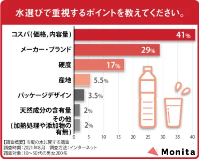 まずはじめにアンケートでは美味しい水を選ぶ際のポイントを調査しました。その結果、1位は「コスパ」で41%、2位は「メーカー・ブランド」で29%、3位は「硬度」で17%という結果になりました。