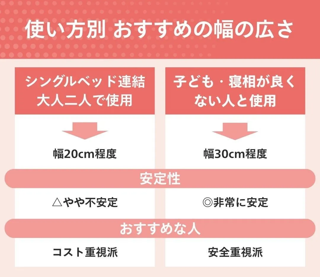 隙間パッド選びで最も多い失敗は、パッドが隙間に落ちてしまうという現象です。これを防ぐ鍵となるのが幅です。一般的なパッドは幅20cm程度ですが、小さなお子様と添い寝をするご家庭や、寝返りが激しい方には幅30cm以上のワイドタイプを強く推奨します。