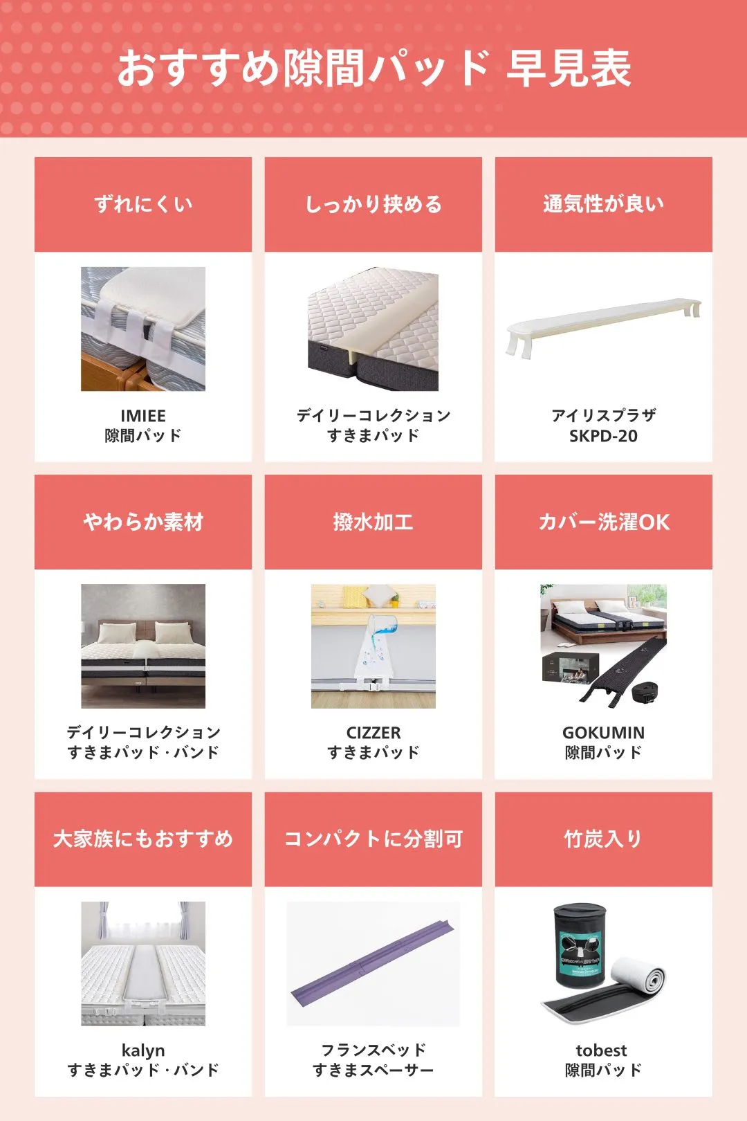 汚れ防止 すきまパッド N\A | ![]() | Amazon楽天 | 撥水加工付きで小さいお子さんと連結した布団用にもぴったり | 195×30×7cm | ポリウレタン | あり | 可能 |