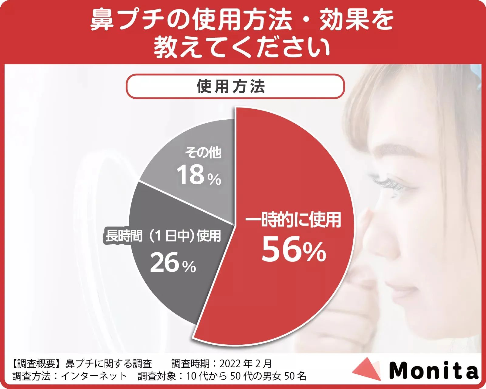 同時に鼻プチの使用方法についても調査しましたが、「一時的に鼻の形を綺麗に見せるために使用」している方は約5割、「癖付けのため長時間(1日中)使用」している方は約3割です。