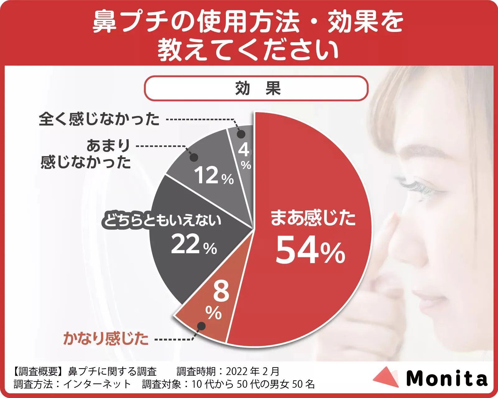 鼻プチを使用するにあたって、最も気になるのは効果です。鼻プチを実際に使用して効果を感じたかどうかをアンケート調査したところ、5割以上の方が効果を感じていると判明しました。