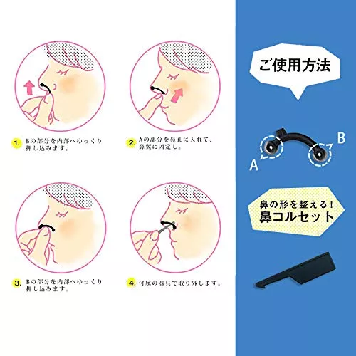 美容整形テクニックに基づいて作られたノーズクリップです。1日約30分付けるだけで、鼻筋と鼻先をピンポイントで押圧します。シンプルで誰でも使いやすく、チタンワイヤーでどんな形の鼻にもフィットする使い勝手のいい商品です。