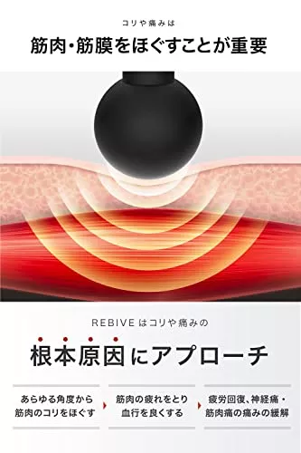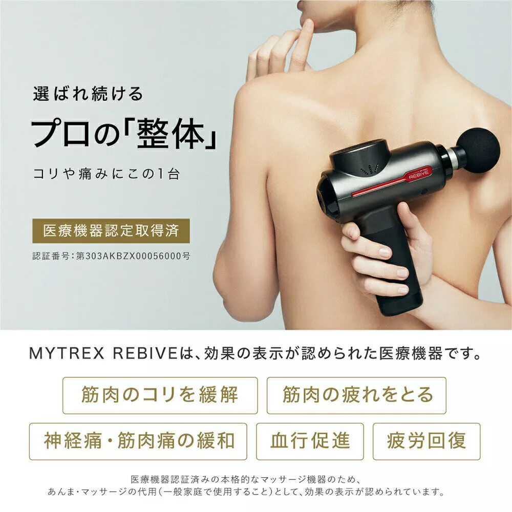 マイトレックス リバイブは、医療機器認証済みのコンパクトな本格マッサージガンです。付属している5つのアタッチメントを付け替えることであらゆる角度から点の刺激で筋肉のコリにアプローチできます。