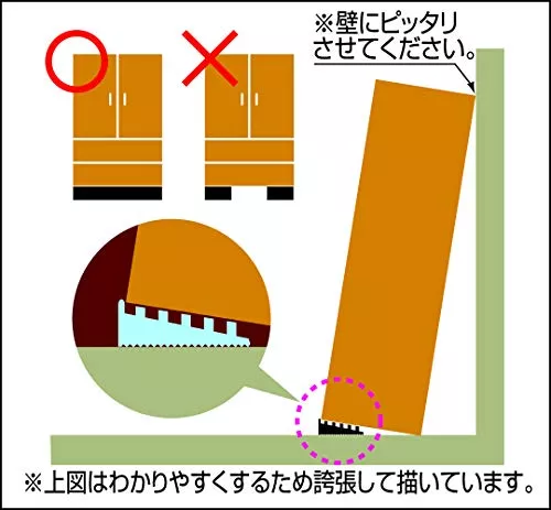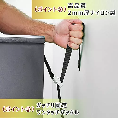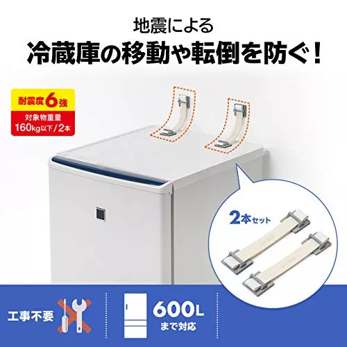 冷蔵庫を壁に固定して、冷蔵庫の転倒や移動を防いでくれる固定バンドです。取り付け方は2通りで、天板に2本設置する方法・天板に1本と側面に1本設置する方法があります。耐震度は6強で、2本使用で160kgの重量に使用可能です。