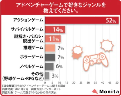 アドベンチャーゲームで好きなジャンルを100人にアンケートしたところ、「アクションゲーム」が5割以上の票を集める結果 になりました。爽快なバトルを楽しみながら、ゲームの中を冒険するのは楽しいものです。