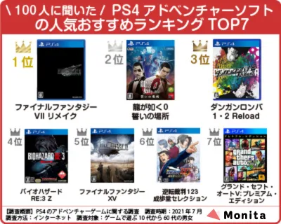 今回は、100 人を対象にPS4アドベンチャーゲームに関するアンケート でおすすめ作品を調査しました。その結果、ファイナルファンタジーVII リメイク・龍が如く0 誓いの場所・ダンガンロンパ1・2 Reloadが票を集めました。多くの名作がランクインしているので、ぜひ最後までご覧ください。