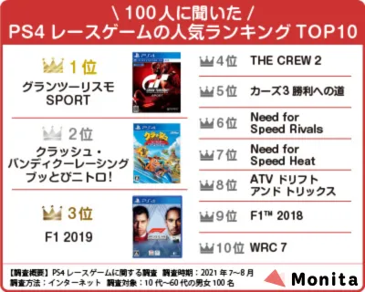 今回は男女100名を対象におすすめのPS4レースゲームを調査した結果、1番人気はグラフィックの評価が特に高い「グランツーリスモ SPORT」でした。アンケートで集まった口コミと合わせて、PS4レースゲームの人気おすすめランキングをご紹介します。