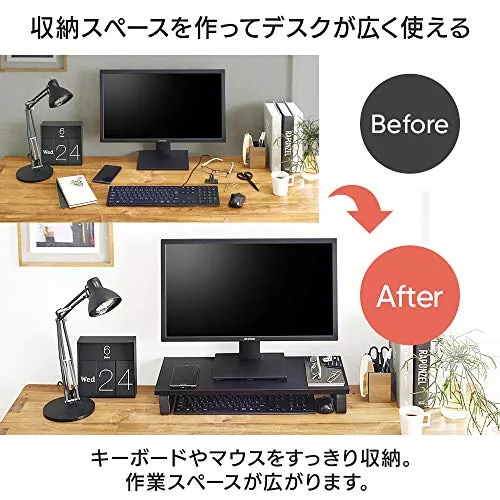 またモニター台を使うと、デスクを広く使えるのもポイントです。筆記作業をするときなどはモニター台の下にキーボードや文房具を収納してデスクを広く使えます。デスクの狭さに困っている方や、デスク周りを整頓させたい方におすすめです。
