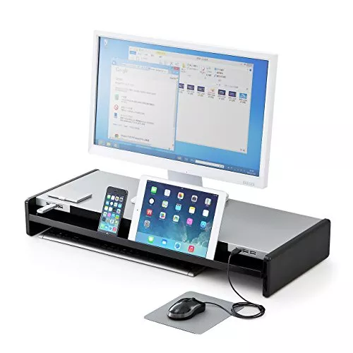 小物やスマホを収容できるスペースがあるモニター台です。座り方を矯正し、目を保護しデスクスペースを有効活用できます。充電接続口があるのもこのモニター台の特徴です。配線をスッキリさせるのにも役立ちます。
