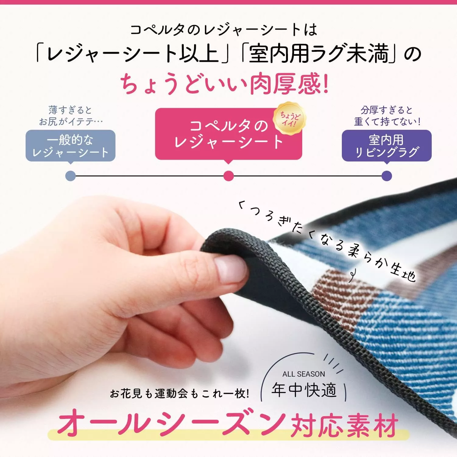 ただし、起毛素材といっても種類はさまざまです。毛足が長くフリース素材のようになっているレジャーシートは温かく快適ですが、夏の使用にはあまり向いているとは言えません。一方で、毛足の短いものは1年を通して快適に使用できます。