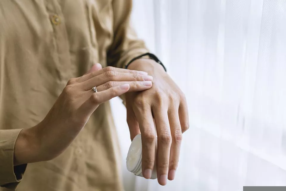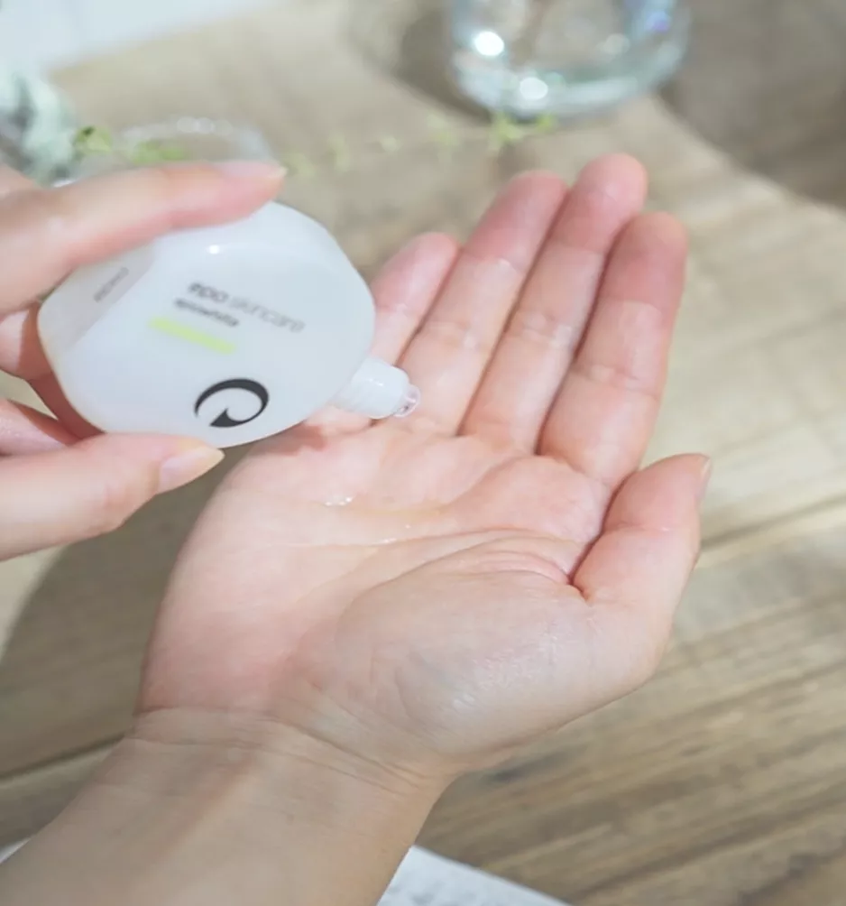 肌馴染みをよくするために、手にとったエポホワイティアを人肌に温めます。手のひらを合わせて体温に近づけましょう。