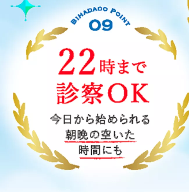 東京美肌堂は22時まで診療の受付をしているので、仕事が終わった後や家事が落ち着いた後などスキマ時間に診察を受けやすいです。また、土日祝日も休まず対応しているので、平日仕事が忙しい方でも休みの日に受診できます。