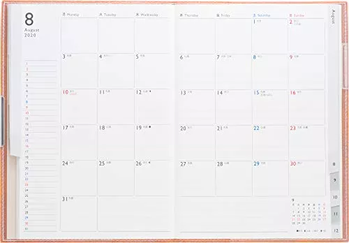 一般的なカレンダーと全く同じ、日曜始まりのレイアウトによる月間ブロック予定表。これだけのスペースなのに予定表の左端にメモ用スペースがあります。付録に横罫メモと別冊ノート、ペンホルダーなどが付き1,000円を切る価格も魅力です。