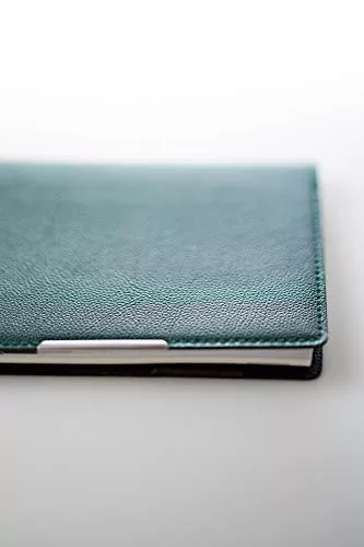 手をかけて表紙を開く個所に金具がついていて、これがアクセントになっておりかっこいいです。バッグに入れることを想定していながら、会議室に移動したり接客応対するときは、スーツの内ポケットにも入れることができるちょうどいいサイズです。