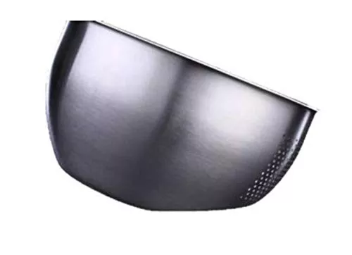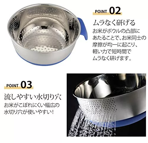 ボウルの縁は0.5mmと薄めですが、長いので持ちやすくなっています。全体が抗菌ステンレス製で衛生的で耐久性があるのもポイントです。水抜き穴は水を捨てるときにお米や食材が流れ出さないよう、小さめに作られています。