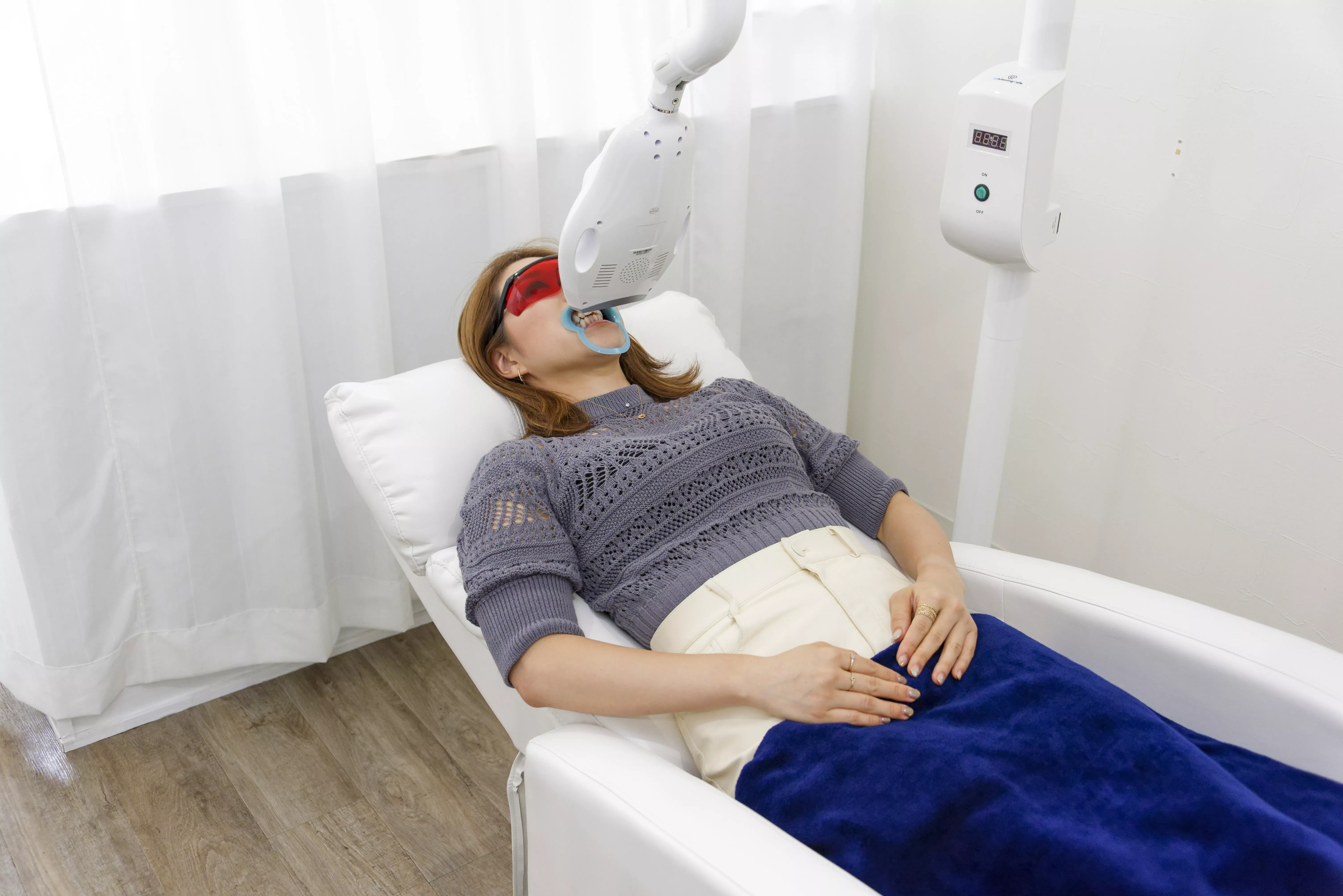 ここまでの工程はサロンのスタッフがサポートしてくれるので、手順を覚えなくても大丈夫です。8分間の照射が終わったら、もう一度同じセットを繰り返します。時間が経つと自動でライトが消えるので、照射しすぎてしまう心配もありません。