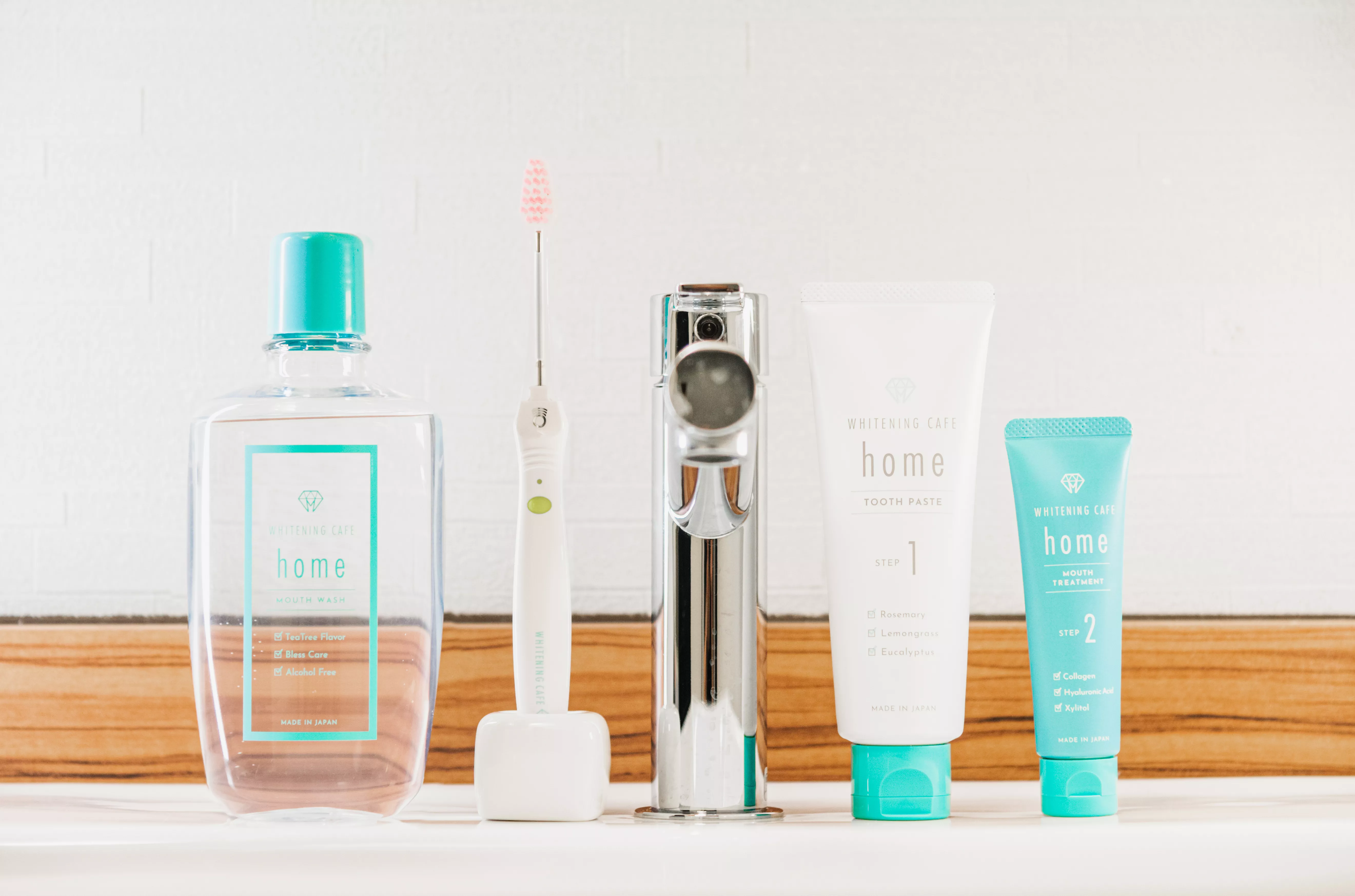 ホワイトニングカフェではホワイトニングに特化したオリジナル商品WHITENINGCAFE home「歯磨き粉、マウストリートメント、イオン歯ブラシ、マウスウォッシュ」を販売しています。店舗で行うサロンケアとお家で行うホームケアを並行して行っていただくと、より効果が長持ちし、輝く白い歯をキープできます。