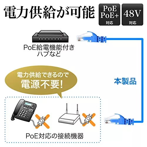 PoE(Power over Ethernet)ケーブルはデータを送受信するためのLANケーブルの機能に加え、PoE対応機器への電力を供給が可能です。PoE対応機器の電源を確保する必要がなくなるため、電源ケーブルの配線の混雑を削減できます。