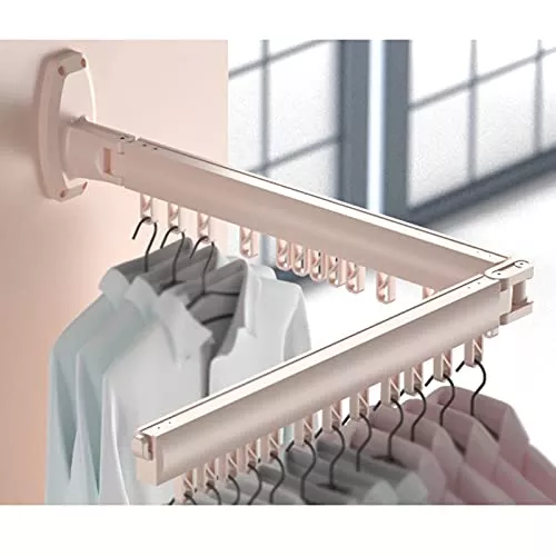 1本の衣類ラックにハンガーが10本掛けられる折りたたみ式の壁掛けハンガーラックです。左から右に180度回転します。使わないときは壁に平らに折りたたむことができ邪魔になりません。
