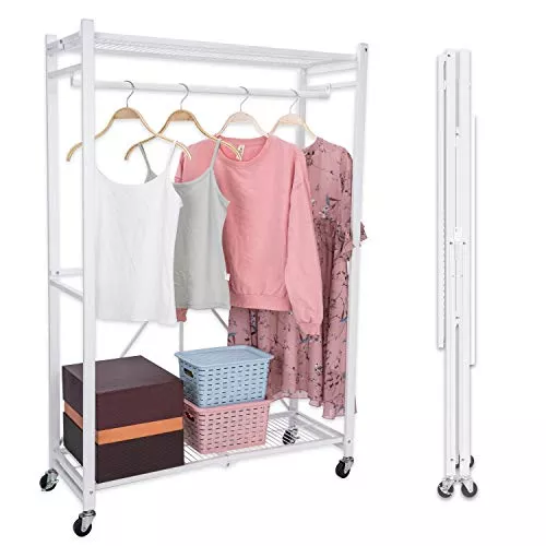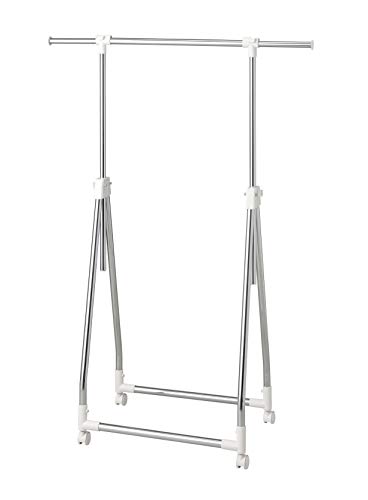 移動しやすいキャスター付き折りたたみハンガーラックです。幅と高さは掛ける量に合わせて調節できるので、ロングコートを掛けたり布団を干したりすることもできます。ホワイトを基調としたシンプルなデザインです。