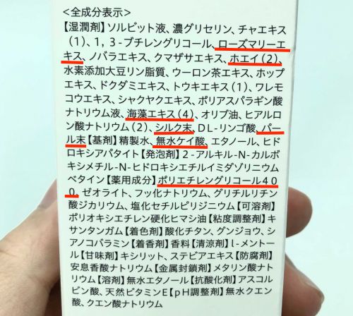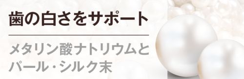 ブラッシングによって歯の白さと歯石沈着を予防をサポートするメタリン酸ナトリウムと白い歯を演出するパール、シルクが配合されています。さらに、ポリアスパラギン酸ナトリウム液やローズマリーエキス、ホエイ、海藻エキスなどを、ホワイトニングに注目した成分をしっかり含んでいます。