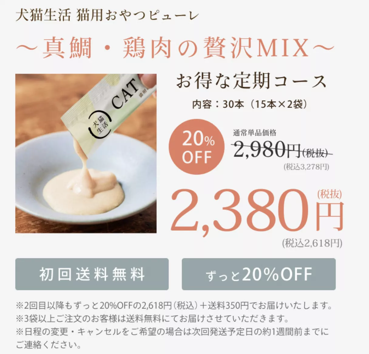 犬猫生活 猫用おやつピューレは定価3,278円(税込)。しかし定期コースを申し込めば初回は2,618円(税込)の送料無料で試せます。2回目以降もずっと20%オフの2,618円(税込)と送料で購入できます。3つ以上の購入で送料無料になるのでまとめ買いもおすすめです。
