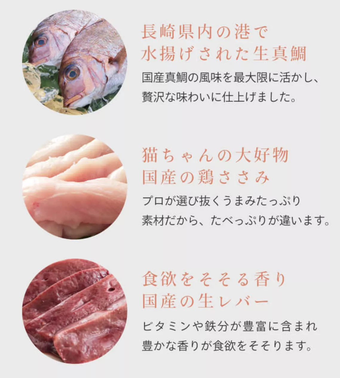 犬猫生活の猫用ピューレには、長崎県内の港で水揚げされた真鯛や国産の鶏ささみ、国産の生レバーが使われています。風味やうま味を最大限生かした製法でタンパク質やビタミン、鉄分をバランスよく取ることができます。