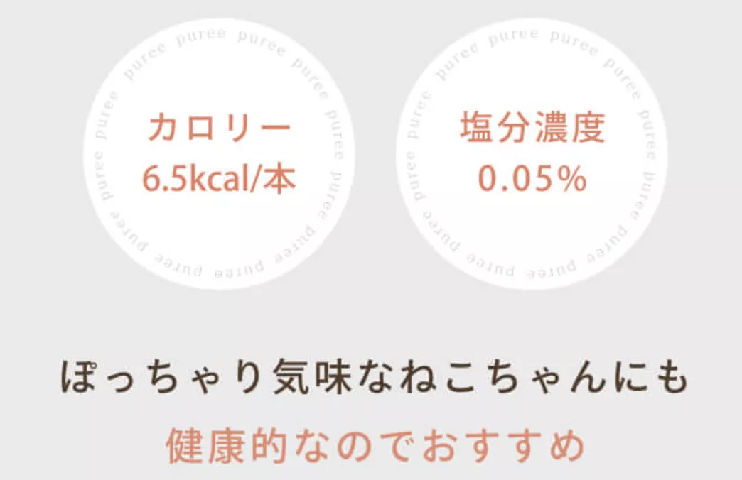 犬猫生活 猫用おやつピューレでは、1本のカロリーは6.5kcalで塩分濃度は0.05%と一般的な猫用のおやつの中ではヘルシーです。
