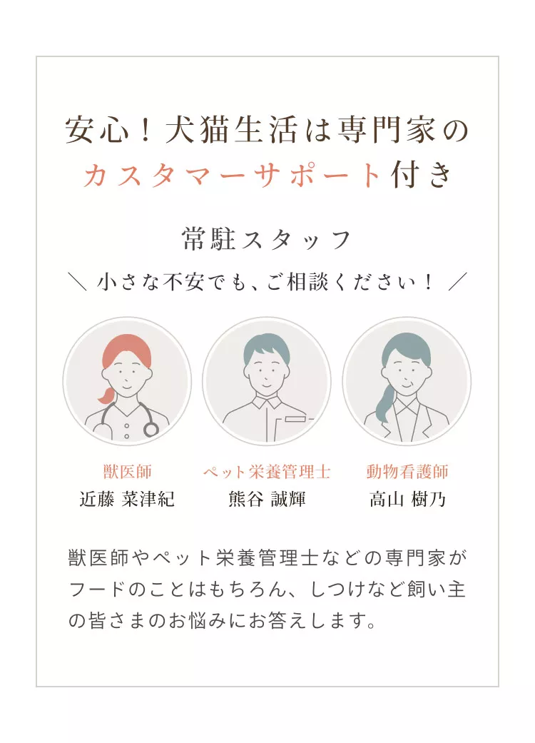 犬猫生活株式会社の商品を購入すると、獣医師やペット栄養管理士、動物看護師によるサポートが受けられます。愛猫のフードのことや健康管理、しつけなどさまざまな疑問や悩みに答えてくれますよ。