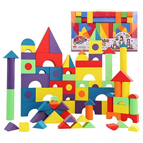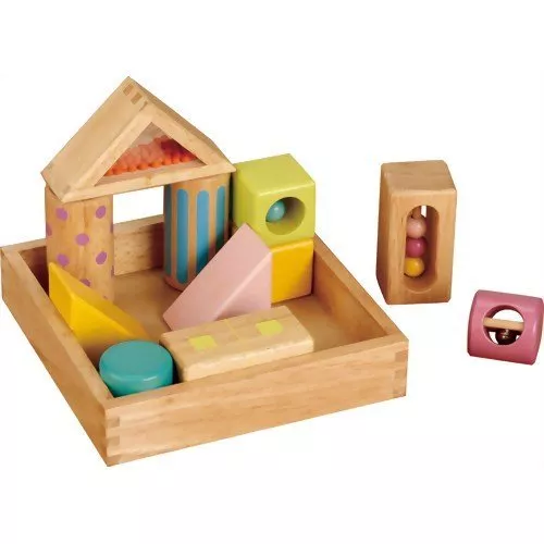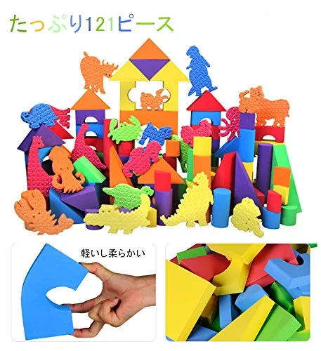 数が多いし、カラフル、形もさまざま。数の少ない音の出る積み木と迷ったがこちらにして良かった。最初は投げるだけ。1歳半でタテに積み重ね出来るように。