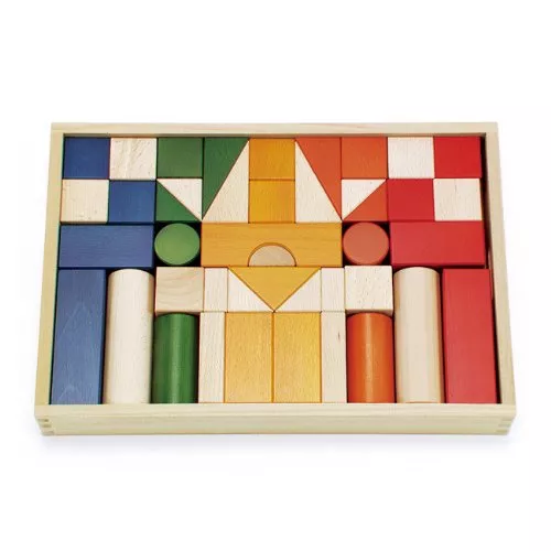 ドイツのトップブランド・Hapeの積み木です。白木とカラー(赤・青・黄・緑)合わせてたっぷり50ピース入っています。筒入りで片付けやすく、世界の安全基準を満たしている品質の高さも魅力です。