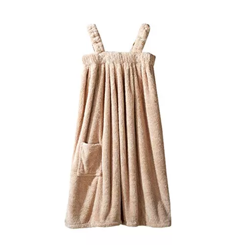 タオル生地のマイクロファイバーが使用されていて、巻きスカートのように体に巻くタンクトップタイプのバスローブです。バスタオル代わりとしても重宝し、肩から胸元にかけて開いていて、スキンケアをしやすくなっています。