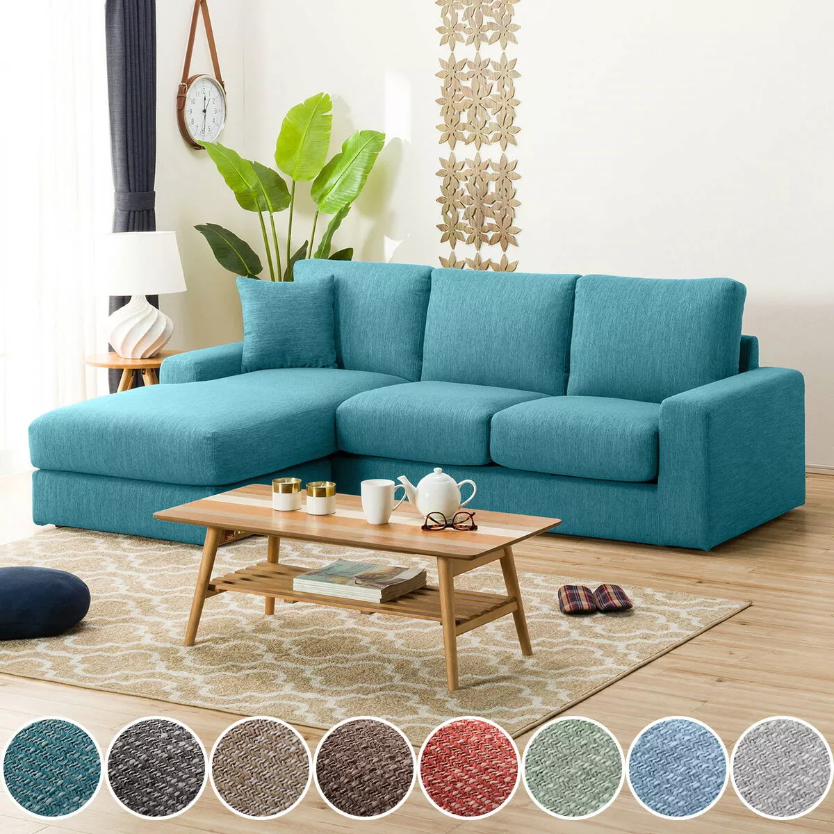 L字型ソファは形がL字になっており、長い座面があるので、伸び伸びとくつろぎたい方におすすめ。L字型に種類は2タイプあり、背もたれと足を伸ばせるスペースがあるのが特徴のカウチソファと、お部屋のコーナー(角)に配置するコーナーソファがあります。