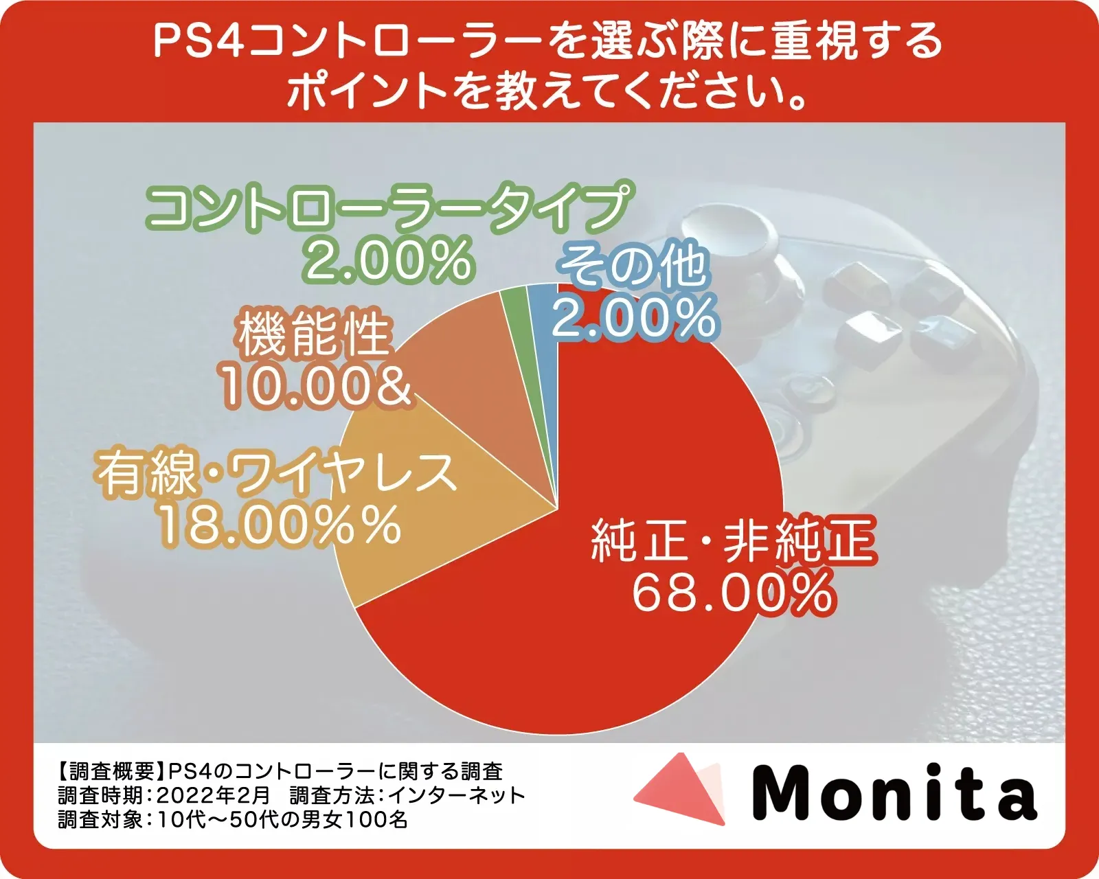 アンケート対象者100人にPS4コントローラーを選ぶうえでどのような点を重要視しているのか伺ったところ、1位が68人で「純正・非純正で選ぶ」といった結果でした。2位が18人で「有線・ワイヤレスで選ぶ」なので、ダントツの1位です。