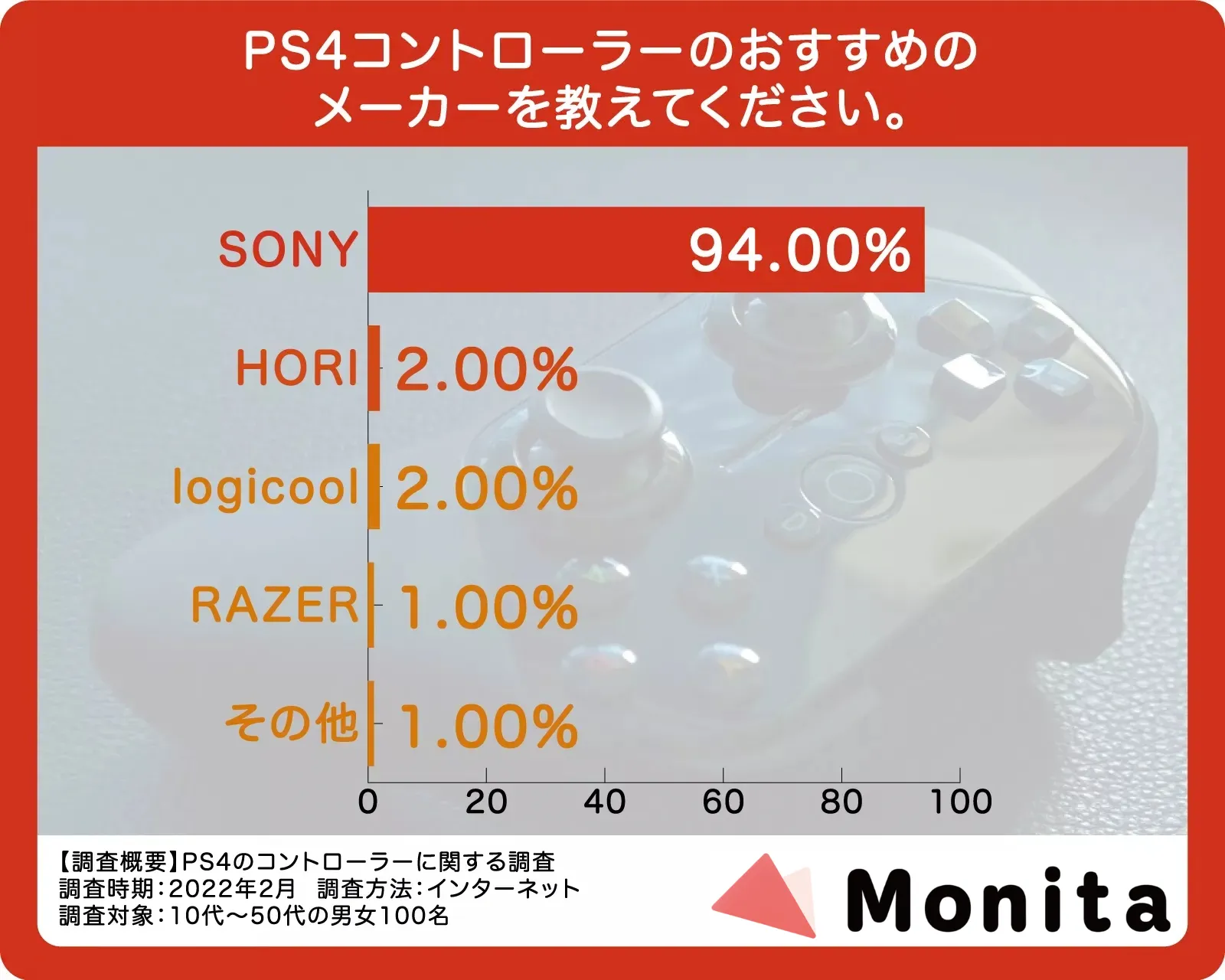 アンケート対象者にPS4コントローラーのおすすめメーカ-を聞いたところ、SONYが94人で圧倒的1位でした。ほとんどの方がSONYがおすすめといった結果になり、後を追う2位は、HORIとLogicoolです。