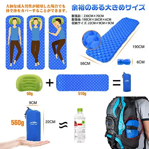 第2位 エアーマット LEEPWEI | Amazon楽天ヤフー | 超軽量型の6cm厚エアーマット | 約190×55×6cm | 約20×8cm | 40デニールナイロン・TPU | 二重バルブ方式 | 〇 | |