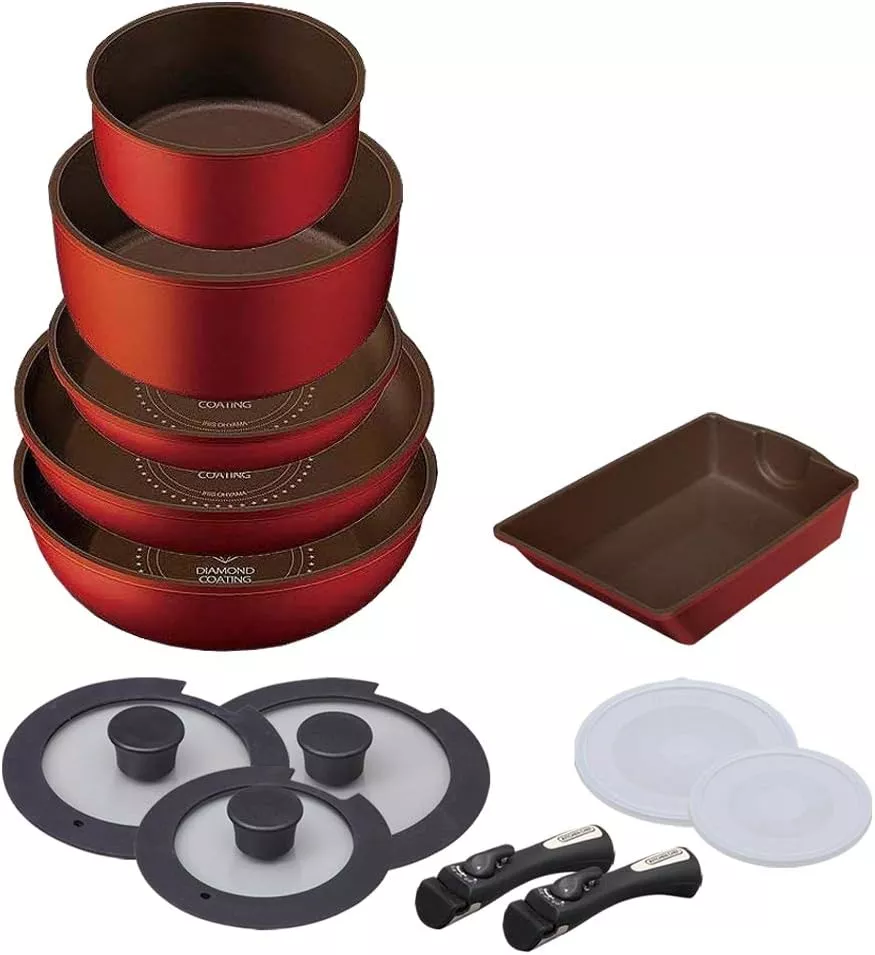 26cmのフライパン・16cmと20cmの鍋・20cmのエッグパン・ガラス蓋・PEシール蓋・マルチハンドルの9点です。ダイヤモンドコーディングにより傷がつきにくい・こびりつきにくい・汚れが落としやすい・丈夫で長持ちなどの特徴があります。