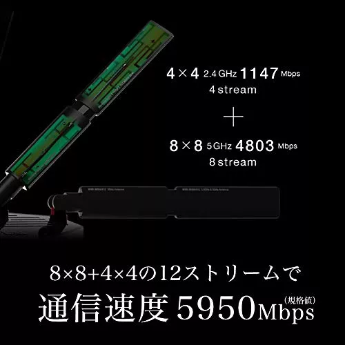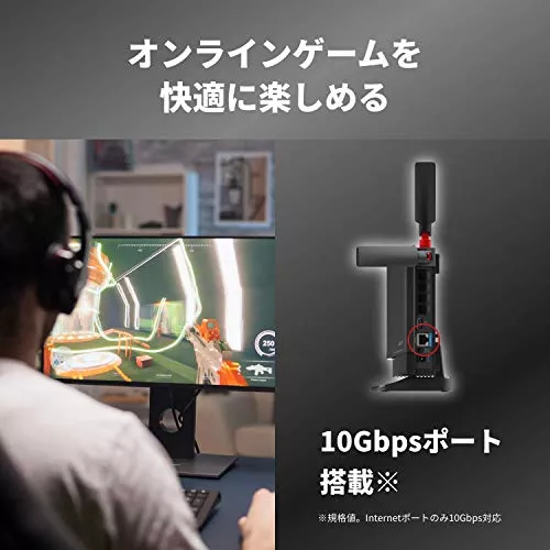 2.4GHzが4×4・5GHzの場合は8×8と、12ストリームで通信速度が5950Mbpsです。アンテナの方向を変えて任意の方向へ強い電波を届けれます。WAN/LANとも、10Gbps対応ポートなのも特徴です。