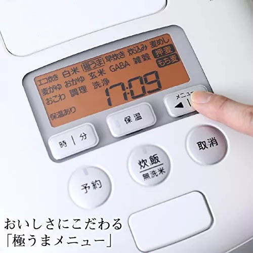 定番のエコ炊き・白米・極うまメニューに加え、早炊き・雑穀米・調理・ケーキなど種類豊富な炊き分けメニューが搭載されています。独自の炊飯プログラムである麦めしメニューもあるので料理の幅が広がる炊飯器です。