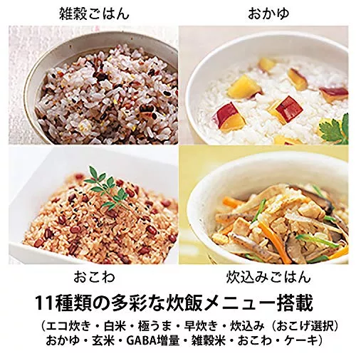 エコ炊き・白米・極うま・玄米・雑穀米など11種類の炊き込みメニューに、黄ばみやパサつきを抑える「つやつや保温」・くっきり見やすい「クリア液晶」・「炊き上がり予約メモリー」といった機能が付いている炊飯器です。