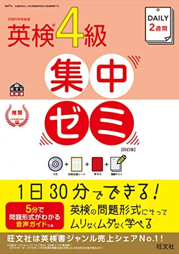 英検の総復習ができる4級予想問題集です。英検受験者の間違いやすい問題を分析し、掲載しています。7日間で復習ができるので、本番前の一冊としておすすめです。CDも付いていますが、同じ内容の音声を無料でダウンロードできます。