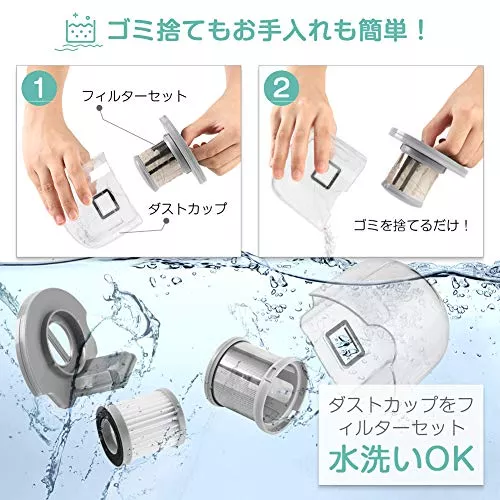 医療現場でも殺菌に使われるUVランプを使用しているので、お掃除しながら除菌も一緒にできます。また、ダストカップ・フタ・フィルターは水で丸洗いできるため、常に清潔に使える点もポイントです。