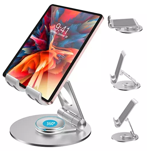 360度回転可能なベースにタブレットスタンド、折り畳みアームの組み合わせで、自由自在に角度や高さを調節できるiPadスタンドです。どんな体勢のときでも絶妙な角度や高さでタブレットを使えます。