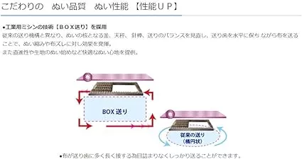 BOX送りは工業用ミシンに採用される技術ですが、JUKIではその機能を家庭用ミシンにも搭載しています。薄い布を縫うときでも縫い縮みを防ぎ、美しい縫いを実現してくれる機能です。縫いにくいタオル地やパイル地もスムーズに送れます。