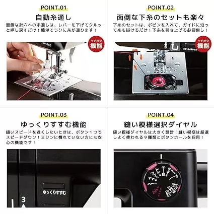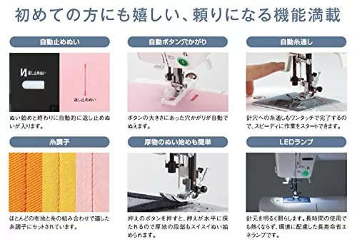 - 主な機能:糸調子・自動ボタン穴かがり・自動糸通し
