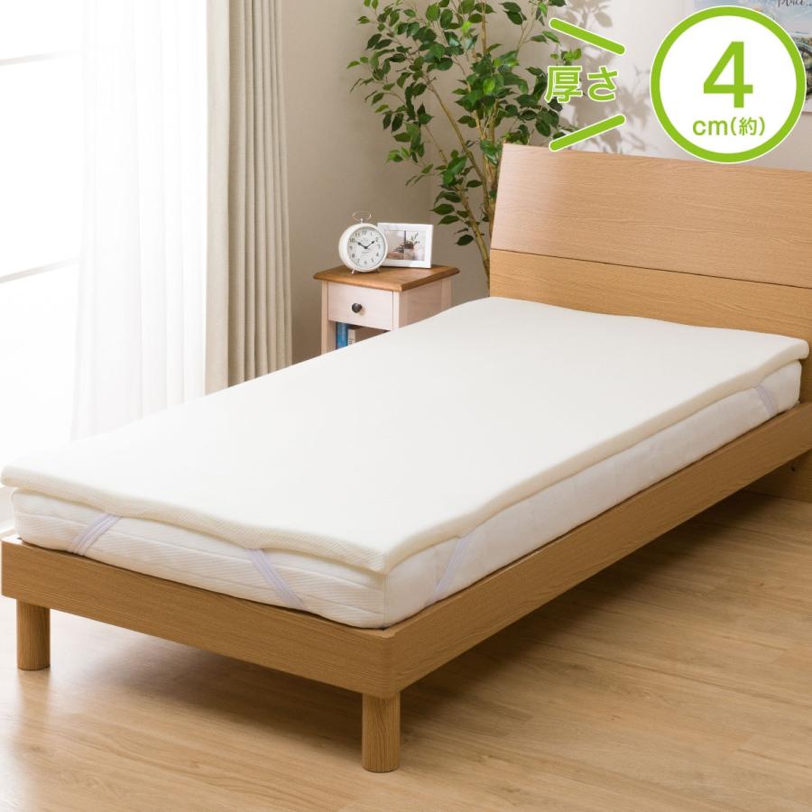 厚さ4cmで作られており、柔らかい低反発タイプのため寝返りや揺れにもしっかりフィットできるマットレストッパーです。ゴムバンドが付属しているため、布団やベッドに固定しやすいです。形状記憶スポンジ付きです。