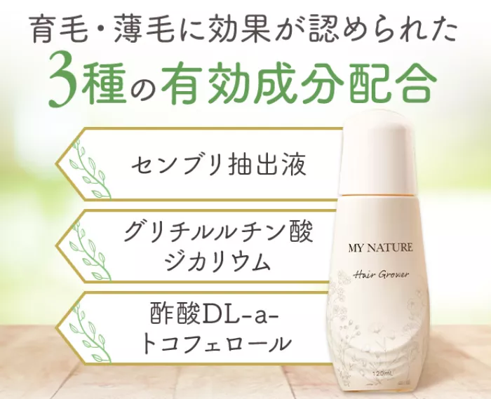 マイナチュレには、女性の育毛をサポートする3つの育毛成分、センブリ・グリチルリチン酸カルシウム・酢酸DL-αトコフェロールが配合されています。有効成分の成分配合量や分子のサイズを調節し、頭皮の表面と角層、両方にアプローチが可能です。