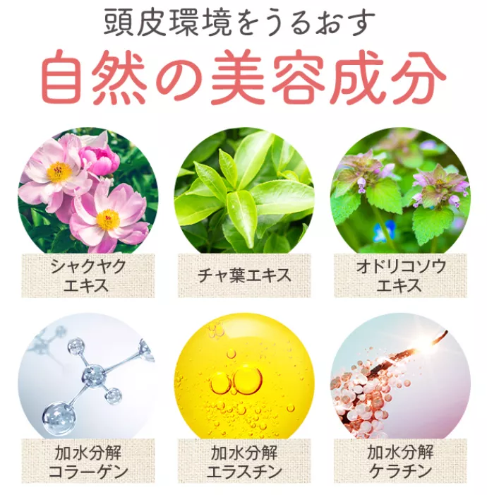 マイナチュレには有効成分のほか、頭皮を潤し頭皮環境を整える自然由来の美容成分が配合されています。育毛効果をサポートする働きのほか、頭皮を乾燥から防いで健やかに保ち、髪1本1本にコシを与え、ハリツヤのある髪へと導く処方です。