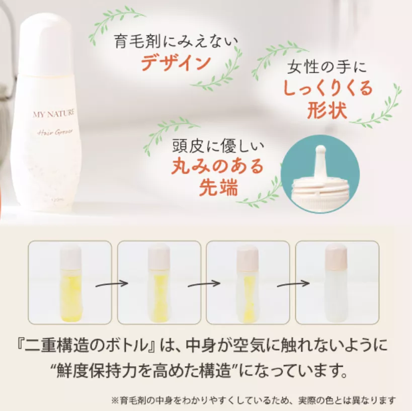 マイナチュレのボトルは一見育毛剤に見えない洗練されたデザインになっており、女性から好評です。また、中身が空気に触れない二重構造設計なので、最後まで酸化しにくい新鮮な状態を保てます。